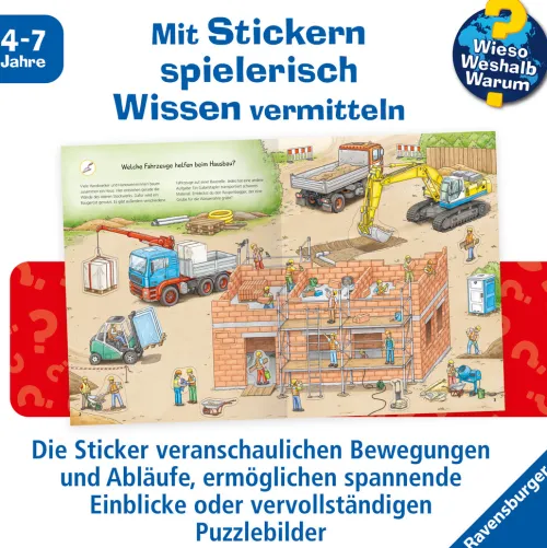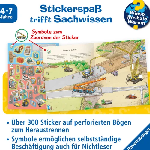 Was können Bagger alles? Welche Fahrzeuge helfen beim Straßenbau? Was passiert in einem Betonmischer? Mit über 300 Stickern entdecken Kinder die spannende Welt der Baustellenfahrzeuge. Sie bewegen schwere Betonplatten mit dem Kran, heben mit dem Bagger eine Baugrube für ein Haus aus und kippen Asphalt in den Straßenfertiger. Dabei erfahren die Kinder, wie die unterschiedlichen Fahrzeuge funktionieren und wo sie zum Einsatz kommen.