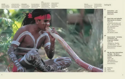 Rote Sandwüsten und grüne Wildnis, menschenleere Traumstrände und lebhafte Metropolen – Australien ist ein Kontinent voller Kontraste. Erst vor 100 Jahren wurde der Staat Australien gegründet, obwohl dort eine der ältesten Kulturen der Welt beheimatet ist, die Aborigines. Ihre uralte Mythologie wird bestimmt von einer großartigen Natur und der berühmte Ayers Rock ist für die Aborigines der heilige Berg Uluru. In der unendlichen Weite des fünften Kontinents hat sich über Jahrmillionen eine einzigartige und faszinierende Tier- und Pflanzenwelt entwickelt. Kängurus und Koalas sind die bekanntesten Repräsentanten des Landes. Vor der Ostküste erstreckt sich das Great Barrier Reef, das größte Riff der Erde, mit seinen unzähligen Arten von Korallen und exotisch bunten Fischen. 170 Bilder zeigen den Kontinent Australien in all seiner Vielfalt und vier Specials berichten über die Geschichte der europäischen Besiedlung, über die unermesslichen Distanzen des Landes, über die faszinierende Tierwelt und die Kunst und Kultur der Aborigines. REISE DURCH . . . ist eine Bildband-Reihe professionell fotografiert von renommierten Reisefotografen – – – Bis zu 230 Bilder auf 128 bis 140 Seiten – – – Sensationell günstiger Preis – – – Alle wichtigen Sehenswürdigkeiten – – – Kultur und Traditionen – – – Kenntnisreiche Texte – – – Ausführliche Bildunterschriften – – – Farbige Übersichtskarte – – – Detailliertes Register.