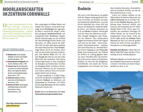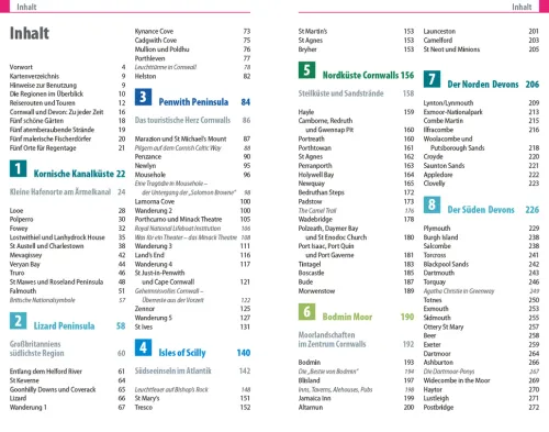 – Übersichtsseiten mit Beschreibungen aller Regionen: Kornische Kanalküste, Lizard Peninsula, Penwith Peninsula, Isles of Scilly, Nordküste Cornwalls, Bodmin Moor, Norden Devons, Süden Devons