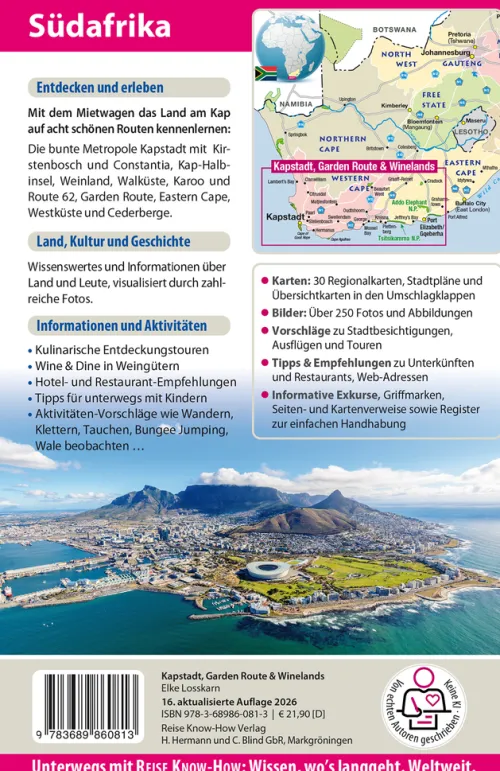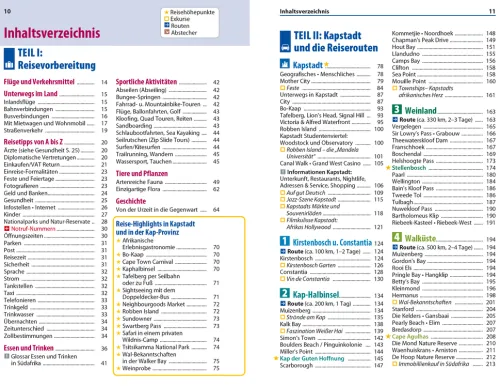 Die Vielfalt der einheimischen Kultur wie auch der Tierwelt ist geradezu überwältigend. Die aufregende Mischung aus zerklüfteten Bergen, schönem Wetter, hilfsbereiten Menschen sowie guter Infrastruktur macht das Kap zu einem idealen Reiseziel. Neben den Routenempfehlungen finden sich in diesem Südafrika-Reiseführer zahlreiche Geheimtipps für Genuss, Abenteuer und Entspannung – vom Wine Tasting in den Winelands über Trommel-Workshops in Kapstadt bis zur Bootstour zu den Jagdgründen des Weißen Hais.