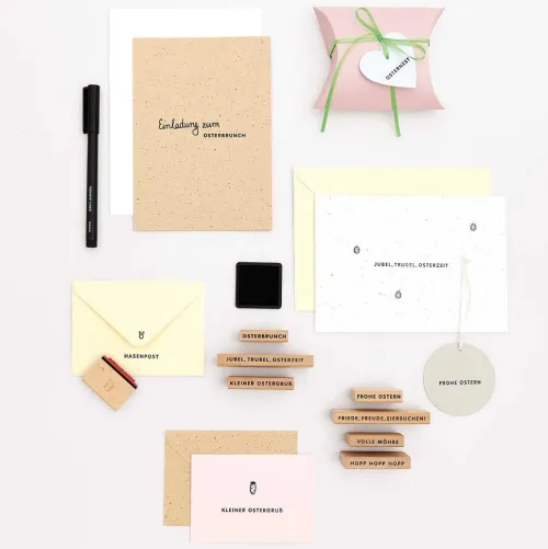 Gestalten Sie individuelle Ostergrüße! Dieses Stempelset enthält ein Stempelkissen sowie Stempel mit verschiedenen Textelementen zum Osterfest und kleine Stempel mit passenden Motiven wie Hasenköpfen, Möhren und Ostereiern.