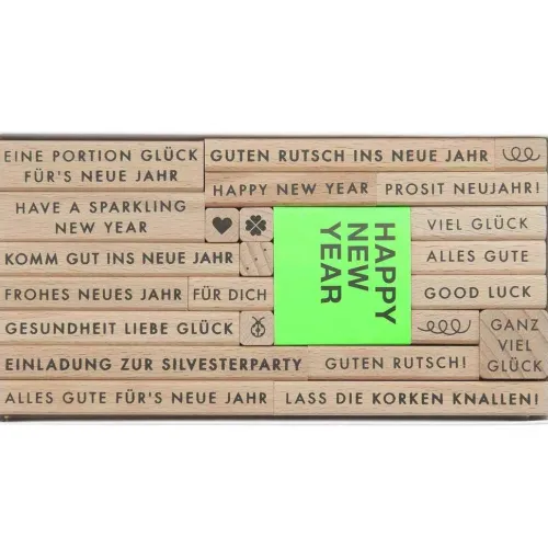 Unser Stempelset Happy New Year zeigt coole Silvester-Schriftzüge und passende Motive. So können individuelle Grußkarten, Einladungs- und Tischkarten, aber auch Geschenkanhänger einfach gestaltet werden. Das Set enthält 23 Holzstempel in verschiedenen Größen, sowie ein Stempelkissen in schwarzer Farbe. Inhalt: FSC 100%, 23 Stempel. Maße: 30 x 80 x 160 mm.