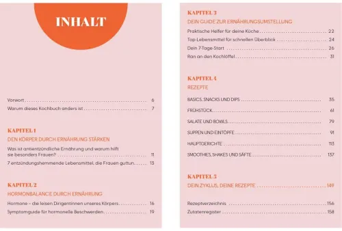 Eine fundierte Einführung in die Grundlagen, praktische Tipps und eine übersichtliche Liste entzündungshemmender Lebensmittel sowie vielseitige, darmfreundliche Gerichte machen dieses Kochbuch zu einem wertvollen Begleiter für Frauen, die ihre hormonelle Balance fördern, ihren Zyklus unterstützen und ihre Energie nachhaltig steigern möchten. Ob vegetarisch, vegan, glutenfrei oder einfach gesund – hier findest du Wissen und Inspiration für mehr Lebensfreude und Vitalität.