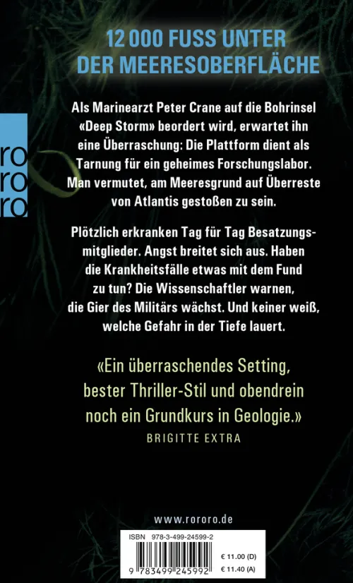 12. 000 Fuß unter der Meeresoberfläche. Als Marinearzt Peter Crane auf die Bohrinsel «Deep Storm» beordert wird, erwartet ihn eine Überraschung: Die Plattform dient als Tarnung für ein geheimes Forschungslabor. Man vermutet, am Meeresgrund auf Überreste von Atlantis gestoßen zu sein. Plötzlich erkranken Tag für Tag Besatzungsmitglieder. Angst breitet sich aus. Haben die Krankheitsfälle etwas mit dem Fund zu tun? Die Wissenschaftler warnen, die Gier des Militärs wächst. Und keiner weiß, welche Gefahr in der Tiefe lauert. «Ein überraschendes Setting, bester Thriller-Stil und obendrein noch ein Grundkurs in Geologie.» (Brigitte extra)