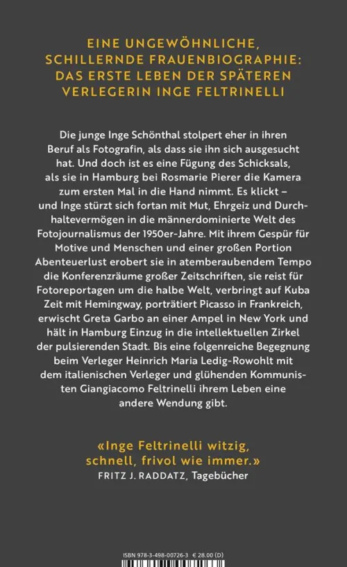 Die junge Inge Schönthal stolpert eher in ihren Beruf als Fotografin, als dass sie ihn sich ausgesucht hat. Und doch ist es eine Fügung des Schicksals, als sie in Hamburg bei Rosmarie Pierer die Kamera zum ersten Mal in die Hand nimmt. Es klickt – und Inge stürzt sich fortan mit Mut, Ehrgeiz und Durchhaltevermögen in die männerdominierte Welt des Fotojournalismus der 1950er-Jahre. Mit ihrem Gespür für Motive und Menschen und einer großen Portion Abenteuerlust erobert sie in atemberaubendem Tempo die Konferenzräume großer Zeitschriften, sie reist für Fotoreportagen um die halbe Welt, verbringt auf Kuba Zeit mit Hemingway, porträtiert Picasso in Frankreich, erwischt Greta Garbo an einer Ampel in New York und hält in Hamburg Einzug in die intellektuellen Zirkel der pulsierenden Stadt. Bis eine folgenreiche Begegnung beim Verleger Heinrich Maria Ledig-Rowohlt mit dem italienischen Verleger und glühenden Kommunisten Giangiacomo Feltrinelli ihrem Leben eine andere Wendung gibt.