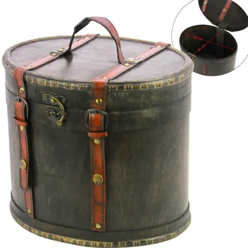 Schatzkiste rund Format Maxi. Diese Schatzkiste ist aus Echtholz gefertigt im Stil der klassischen Hutschachteln vergangener Zeiten. Liebevolle Details und Verzierungen machen diesen Schatzkiste wertvoll und attraktiv. Der Tragegriff erleichtert den Transport. Ein schöner Deko-Artikel, der zudem sehr praktisch ist beim Verstauen und Aufbewahren liebgewordener Dinge. Format ca. 29 x 23 x 25 cm