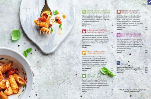 In dem neuen Klassiker findet man nicht nur Grundrezepte und Hauptgerichte, auch kleine Speisen, Vorspeisen und Desserts sind enthalten. Alle raffiniert konzipiert und fotografiert, stets mit dem Augenmerk auf Zeitersparnis. Dabei darf man sich über folgende Kategorien freuen: