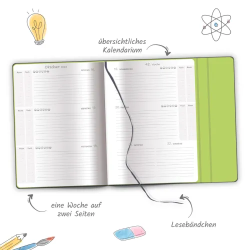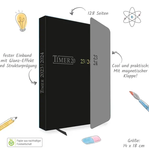 Dieser minimalistische Hardcover Schülerkalender ist mit einer Magnetklappe verschließbar. Er ist ca. 14 x 18 cm groß und bietet auf 128 Seiten genügend Platz für wichtige Notizen und Termine. Für Stundenpläne, Noten, Schulferien, Adressen, Geburtstage usw. gibt es Extra-Seiten. Mit dem Lesebändchen kann der Timer schnell auf der richtigen Seite aufgeschlagen werden.