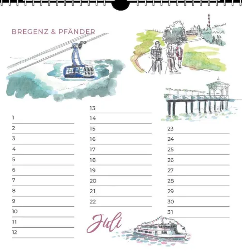 der Geburtstagskalender im quadratischen Format enthält jeden Monat liebevoll gestaltete Aquarelle, die als Collage mehrere Merkmale bekannter Städte rund um den Bodensee darstellen. .