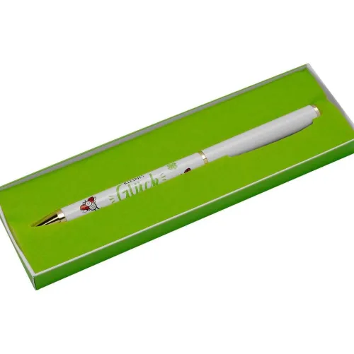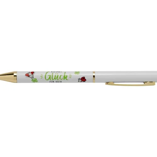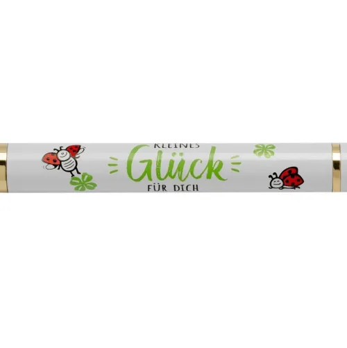 Kugelschreiber mit Motivdruck: „Kleines Glück Für Dich“ mit blauer, austauschbarer Mine und Clip, in Schiebe-Geschenkbox