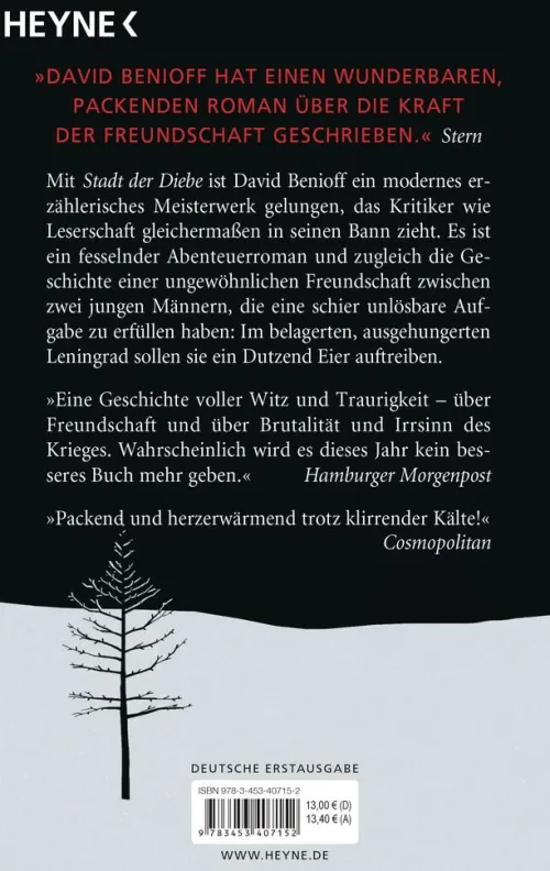 Mit Stadt der Diebe gelang David Benioff ein modernes erzählerisches Meisterwerk, das Kritiker wie Leserschaft gleichermaßen in seinen Bann zog. Es ist ein fesselnder Abenteuerroman und zugleich die Geschichte einer ungewöhnlichen Freundschaft zwischen zwei jungen Männern, die eine schier unlösbare Aufgabe zu erfüllen haben: Im belagerten, ausgehungerten Leningrad sollen sie ein Dutzend Eier auftreiben.