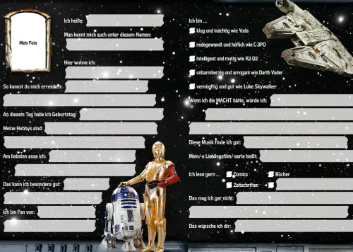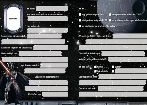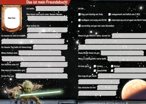 Dieses galaktische Freundebuch ist genau das Richtige für alle Jedi-Ritter. Hier können sich alle deine Freunde verewigen und dir ihre größten Geheimnisse verraten. Mit vielen coolen Eintragungen entsteht so eine einzigartige Erinnerung an die besten Freunde der Galaxie!