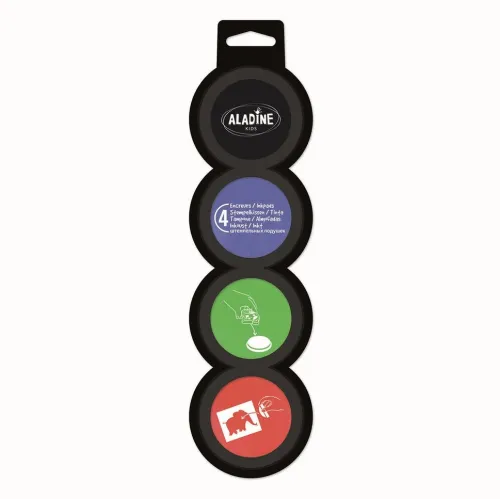 Set mit 4 Kinder Stempelkissen: schwarz/blau/grün/rot. Jedes Stempelkissen ist einzeln abtrennbar. Dank der kleinen Einschnitten auf jeder Seite können kleine Kinderhände diese gut halten. Benutzbar mit allen Kinderstempeln und Schablonen. Durchmesser 3. 5cm.