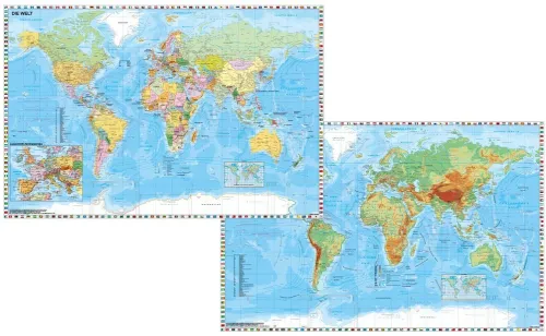 – politische Weltkarte mit Gebirgsrelief und Ausschnitt Zentraleuropa