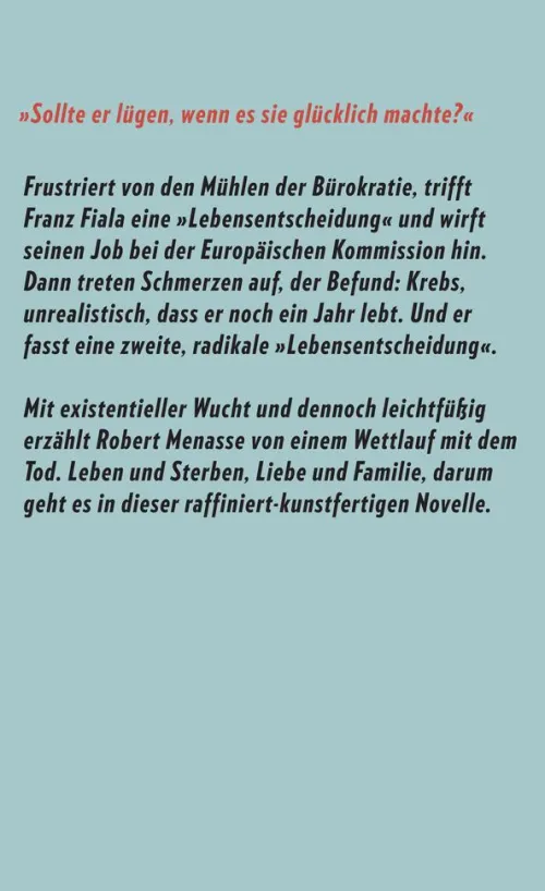 Frustriert von den Mühlen der Bürokratie, trifft Franz Fiala eine »Lebensentscheidung« und wirft seinen Job bei der Europäischen Kommission hin. Als er seine Mutter zum 89. Geburtstag in Wien besucht, verschweigt er ihr jedoch seinen vorgezogenen Ruhestand. Und auch das Gespräch mit Nathalie, mit der er seit vier Jahren in Brüssel eine Beziehung führt, über die gemeinsame Zukunft misslingt. Dann treten wiederkehrende Schmerzen auf, die sich nicht länger ignorieren lassen. Der Befund: Krebs, unrealistisch, dass er noch ein Jahr lebt. Und mit einem Mal geht es allein darum, seine Mutter darüber zu täuschen, ihr den Schmerz zu ersparen, ihren Sohn sterben zu sehen: