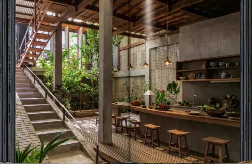 Im Westen Indiens hat Kamal Malik von Malik Architecture, Mumbai für sich und seine Familie ein unkonventionelles, weitläufiges Haus gebaut, das auf sechs Ebenen an und auf einem Kamm über zwei Schluchten thront und – weil es ohne Wände auszukommen scheint – im permanenten Dialog mit der Landschaft steht. Das Haus der drei Ströme verdankt seinen Namen den Bächen, die beim Starkregen der Monsunzeit durch den als Mehrgenerationenhaus angelegten Komplex schäumen und, durch Treppen, Außengänge und Laufstege überbrückt, geschickt in den Gesamtplan integriert sind.