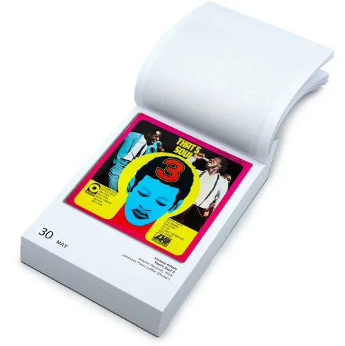 When African-American music broke out of the church in the early 1960s and singers such as Ray Charles and Sam Cooke added secular lyrics to gospel in order to tap into a new audience, the 7″ single was the medium of the hour. The early soul LPs were mostly compilations of successful singles, enriched with cover versions, but this was to change radically in 1971 when Marvin Gaye released „What’s Going On“ against the resistance of his label Motown. After that, there was no stopping him. Sly & The Family Stone, Stevie Wonder, Isaac Hayes, The Temptations, James Brown and countless criminally ignored groups used the medium to comment on grievances and experiment. Songs stretched over ten minutes and left the radio-friendly three-minute format. The music was also given a visual aesthetic, the musicians were given a face and told their story on the backs of the covers. Anyone who had previously raved about Al Green’s voice could now hold him in their hands as an LP, reclining on a wicker chair in a white suit. Today, original LPs are traded for sometimes dizzying sums. Record shops and online exchanges are booming. The feel of the record, the crackling when the needle grips the groove, analogue playback and, last but not least, DJ culture have simply defied the logic of technological progress. They say that the dead live longer. This certainly applies to the LP. This calendar is dedicated to the aura that only an original pressing can have. Als Anfang der 1960er die afroamerikanische Musik aus der Kirche ausbrach und Sänger wie Ray Charles oder Sam Cooke den Gospel mit weltlichen Texten versahen, um ein neues Publikum zu erschließen, war die 7″-Single das Medium der Stunde. Die frühen Soul-LPs waren meist Zusammenstellungen erfolgreicher Singles, angereichert mit Coverversionen. Das sollte sich 1971 radikal ändern, als Marvin Gaye „What’s Going On“ gegen den Widerstand seines Labels Motown herausbrachte. Danach gab es kein Halten mehr. Sly & The Family Stone, Stevie Wonder, Isaac Hayes, The Temptations, James Brown und zahllose sträflich unbeachtete Gruppen, nutzten das Medium, um Missstände zu kommentieren und Experimente zu wagen. Songs dehnten sich über zehn Minuten und verließen das radiofreundliche Drei-Minuten-Format. Zudem erhielt die Musik eine optische Ästhetik, die Musiker bekamen ein Gesicht und erzählten auf den Rückseiten der Cover ihre Geschichte. Wer vorher für die Stimme von Al Green schwärmte, konnte ihn jetzt im weißen Anzug auf einem Korbstuhl fläzend als LP in den Händen halten. Heute werden Original-LPs für teils schwindelerregende Summen gehandelt. Plattenläden und Onlinebörsen boomen. Die Haptik der Platte, das Knistern, wenn die Nadel in die Rille greift, die analoge Wiedergabe und nicht zuletzt die DJ-Kultur haben sich der Logik des technischen Fortschritts einfach widersetzt. Totgesagte leben länger, heißt es. Das gilt allemal für die LP. Jener Aura, die nur eine Originalpressung haben kann, ist dieser Kalender gewidmet.