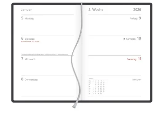 - Praktische Wochenübersicht; Jede Kalenderwoche übersichtlich auf einer Doppelseite