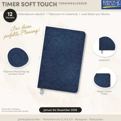 Dieser trendige Timer sieht nicht nur gut aus, er fühlt sich auch gut an. Sein weicher Einband im Lederlook mit filigraner Motivprägung verführt dazu, den Kalender nicht mehr aus der Hand legen zu wollen. Ein 12-monatiges, deutschsprachiges Kalendarium, 128 Seiten, pro Woche 2 Seiten mit viel Platz für Notizen und Leseband runden diesen hochwertigen Taschenkalender ab.
