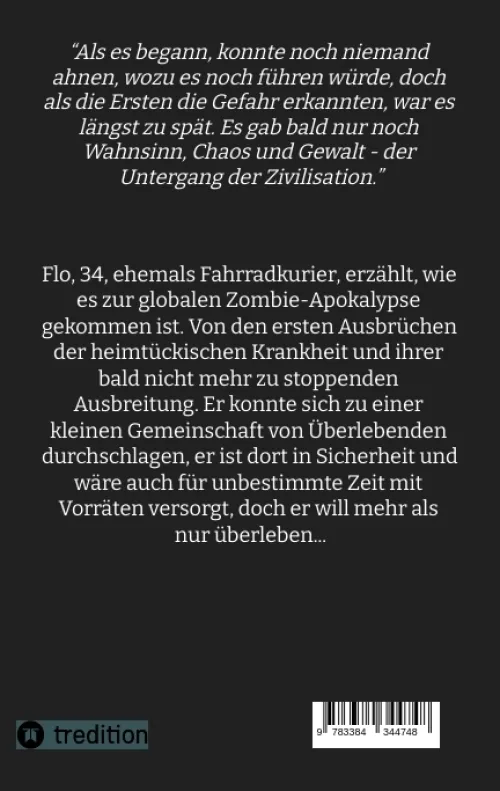 „Als es begann, konnte noch niemand ahnen, wozu es noch führen würde, doch als die Ersten die Gefahr erkannten, war es längst zu spät. Es gab bald nur noch Wahnsinn, Chaos und Gewalt – der Untergang der Zivilisation.“Flo, 34, ehemals Fahrradkurier, erzählt, wie es zur globalen Zombie-Apokalypse gekommen ist. Von den ersten Ausbrüchen der heimtückischen Krankheit und ihrer bald nicht mehr zu stoppenden Ausbreitung. Er konnte sich zu einer kleinen Gemeinschaft von Überlebenden durchschlagen, er ist dort in Sicherheit und wäre auch für unbestimmte Zeit mit Vorräten versorgt, doch er will mehr als nur überleben. . .