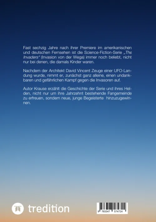 Fast sechzig Jahre nach ihrer Premiere im amerikanischen und deutschen Fernsehen ist die Science-Fiction-Serie „The Invaders“ (Invasion von der Wega) immer noch beliebt, nicht nur bei denen, die damals Kinder waren. Nachdem der Architekt David Vincent Zeuge einer Ufo-Landung wurde, nimmt er, zunächst alleine, einen undankbaren und gefährlichen Kampf gegen die Invasoren auf. Der Autor Krause erzählt die Geschichte der Serie und ihres Helden, nicht nur um ihre alten Fans zu erfreuen, sondern neue, junge Begeisterte hinzugewinnen.