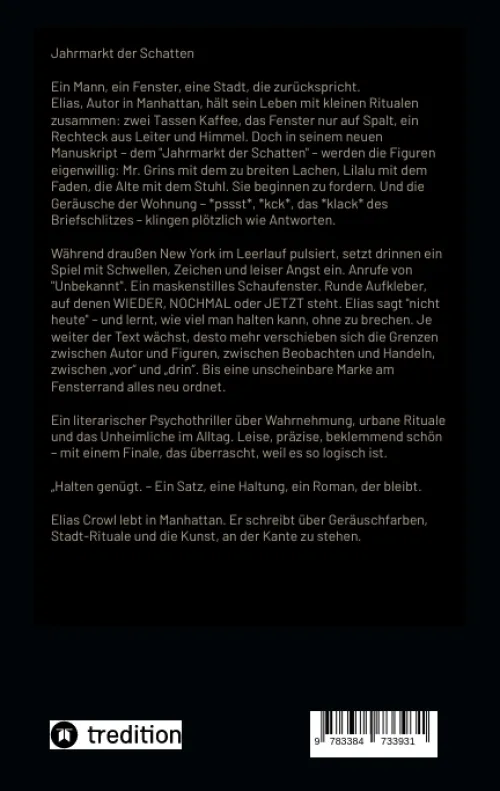 „Jahrmarkt der Schatten“ ist der literarische Psychothriller aus Manhattan, der leise beginnt und groß im Kopf bleibt. In Elias Crowls New-York-Roman kippt Alltägliches ins Unheimliche: Ein Fenster-Rechteck, das nur Leiter und Himmel zeigt. Ein Flur, der „nichts passiert“ sagt. Figuren, die ihren Autor beobachten. Mit poetischer Präzision und Slow-Burn-Suspense führt der Text tief in urbane Rituale, Wahrnehmungsränder und jenes leise Grauen, das man in alten Heizkörpern, Treppenhäusern und Nachtgängen hört. Das Ergebnis ist ein urbaner Thriller mit Horror-Edge – atmosphärisch, gegenwärtig, eigen: literarischer Thriller, leiser Horror, ein New-York-Roman und Manhattan Literatur. Elias, Schriftsteller in Manhattan, hält seine Welt mit Routinen in Schach – zwei Tassen Kaffee, Fenster auf Spalt, ein Rechteck aus Leiter und Himmel. Doch im Manuskript, dem „Jahrmarkt der Schatten“, werden Mr. Grins, Lilalu und die Alte zu Kräften, die zurückschreiben. Türen bleiben zu, Töne werden leiser, die Stadt antwortet – bis ein kleiner runder Aufkleber „HIER“ alles verschiebt. Dieser Roman ist Meta-Mystery und Großstadt-Psychogramm zugleich: präzise, unheimlich, tief menschlich. Wer Wahrnehmungsromane, Metafiktion, urbanen Psychothrill und New-York-Atmosphäre liebt, findet hier ein Buch, das nicht schreit – es flüstert und bleibt. Kurz, warum „Jahrmarkt der Schatten“ überzeugt:Urbaner Nervenkitzel: ohne Blutfontänen – Spannung über Geräusch, Rhythmus, Blick. Einzigartige Bildsprache (Fenster-Rechteck, „Kleine Bühne“, Karte: JETZT). Psychologische Tiefe: Kontrolle, Angst, Halten – und der Mut, „nicht heute“ zu sagen. Brillanter Schluss: überraschend, logisch, berührend – ein Ende, das man spürt. Dieser „literarische Psychothriller“ ist ideal für Leser und Leserinnen subtiler „Suspense“, Buchclubs mit Lust auf Symbolik und alle, die New York als Klangraum erleben wollen. „Jahrmarkt der Schatten“ vereint leisen Horror mit poetischem Nervenkitzel – ein Roman, der zeigt, wie viel Wirklichkeit wir aushalten, ohne sie zu erfinden. Jetzt entdecken: Manhattan, Metafiktion, Spannung – in einer Stimme, die man wiedererkennt.