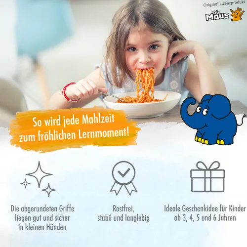 Das farbenfrohe 3-teilige Besteck-Set von der Maus macht jede Mahlzeit zu einem Vergnügen, und Kinder ab drei Jahren lernen gemeinsam mit der Maus, dem Elefanten und der Ente kindgerecht, mit Löffel, Gabel und Messer zu essen. Die breiten, abgerundeten Griffe liegen dabei sicher in der Hand. Robust und langlebig aus rostfreiem, hochwertigen Edelstahl. Handspülung empfohlen.