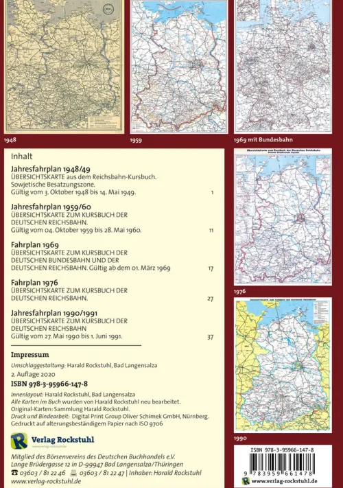 Broschur, A 4 (aufgeschlagen A 3), 54 Seiten. 5 Fahrpläne – teilsweise vergrößert als Nachdruck. INHALT:Jahresfahrplan 1948/49ÜBERSICHTSKARTE aus dem Reichsbahn-Kursbuch. Sowjetische Besatzungszone. Gültig vom 3. Oktober 1948 bis 14. Mai 1949. Jahresfahrplan 1959/60ÜBERSICHTSKARTE ZUM KURSBUCH DER DEUTSCHEN REICHSBAHN. Gültig vom 04. Oktober 1959 bis 28. Mai 1960. Fahrplan 1969ÜBERSICHTSKARTE ZUM KURSBUCH DER DEUTSCHEN BUNDESBAHN UND DER DEUTSCHEN REICHSBAHN. Gültig ab dem 01. März 1969 Fahrplan 1976ÜBERSICHTSKARTE ZUM KURSBUCH DER DEUTSCHEN REICHSBAHN. Jahresfahrplan 1990/1991 ÜBERSICHTSKARTE ZUM KURSBUCH DER DEUTSCHEN REICHSBAHN Gültig vom 27. Mai 1990 bis 1. Juni 1991.