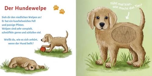 Fühl mal hier, wie macht das Tier? Streichle über das weiche Fell und du kannst hören, wie die Katze miaut, der Hund bellt und das Küken quiekt. Außerdem kannst du sehen, was die Tierkinder fressen und wie sie spielen. Tönendes Buch. Fühlbuch