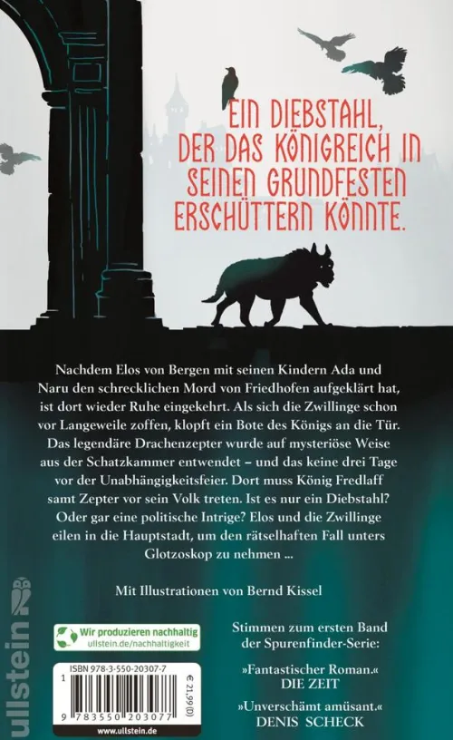 Nachdem der Spurenfinder Elos von Bergen zusammen mit seinen Kindern Ada und Naru den schrecklichen Mord am Dorfvorsteher aufgeklärt hat, ist Ruhe eingekehrt in Friedhofen. Die Zwillinge beginnen sich schon wieder zu zoffen, so langweilig ist ihnen, da klopft zum Glück ein Bote König Fredlaffs an die Tür. Das legendäre Zepter der Ahnen wurde unter unerklärlichen Umständen aus der königlichen Schatzkammer entwendet – und das keine drei Tage vor der Unabhängigkeitsfeier, bei der Fredlaff samt Zepter vor sein Volk treten muss. Ist es nur ein Diebstahl oder verbirgt sich mehr dahinter? Gar eine politische Intrige? Elos und die Zwillinge eilen in die Hauptstadt, um den mysteriösen Fall unters Glotzoskop zu nehmen . . .
