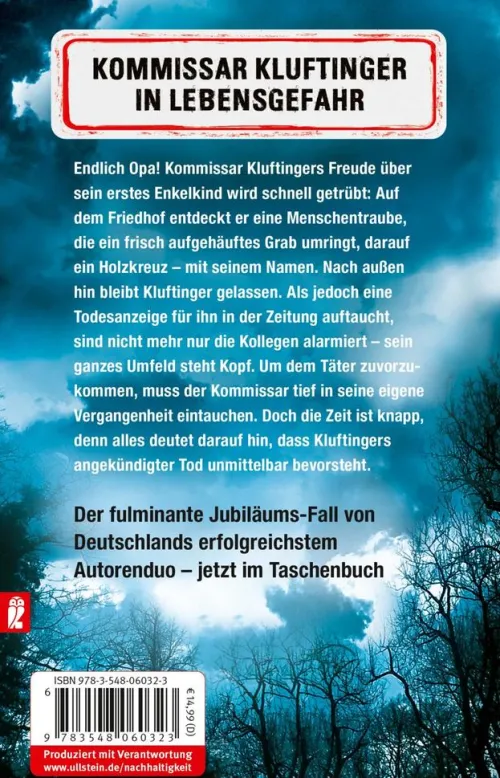 Endlich Opa! Kommissar Kluftingers Freude über sein erstes Enkelkind wird schnell getrübt: Auf dem Friedhof entdeckt er eine Menschentraube, die ein frisch aufgehäuftes Grab umringt, darauf ein Holzkreuz – mit seinem Namen. Nach außen hin bleibt Kluftinger gelassen. Als jedoch eine Todesanzeige für ihn in der Zeitung auftaucht, sind nicht mehr nur die Kollegen alarmiert – sein ganzes Umfeld steht Kopf. Um dem Täter zuvorzukommen, muss der Kommissar tief in seine eigene Vergangenheit eintauchen. Doch die Zeit ist knapp, denn alles deutet darauf hin, dass Kluftingers angekündigter Tod unmittelbar bevorsteht.