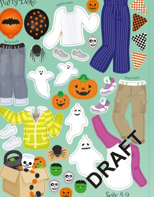Komm mit auf eine Halloween-Party! Kleide die Mädchen in ausgefallene Kostüme, schmücke mit ihnen das Haus und sammle leckere Süßigkeiten ein – über 360 Sticker, davon viele mit Glitzer, machen es möglich!