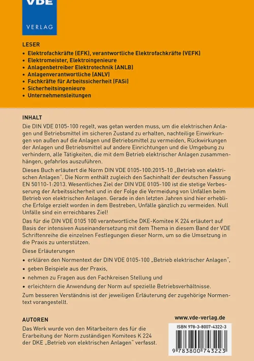 Die DIN VDE 0105-100 regelt, was getan werden muss, um die elektrischen Anlagen und Betriebsmittel im sicheren Zustand zu erhalten, nachteilige Einwirkungen von außen auf die Anlagen und Betriebsmittel zu vermeiden, Rückwirkungen der Anlagen und Betriebsmittel auf andere Einrichtungen und die Umgebung zu verhindern, alle Tätigkeiten, die mit dem Betrieb elektrischer Anlagen zusammenhängen, gefahrlos auszuführen. Dieses Buch erläutert die Norm DIN VDE 0105-100:2015-10 „Betrieb von elektrischen Anlagen“. Die Norm enthält zugleich den Sachinhalt der deutschen Fassung EN 50110-1:2013. Wesentliches Ziel der DIN VDE 0105-100 ist die stetige Verbesserung der Arbeitssicherheit und in der Folge die Vermeidung von Unfällen beim Betrieb von elektrischen Anlagen. Gerade in den letzten Jahren sind hier erhebliche Erfolge erzielt worden in dem Bestreben, Unfälle gänzlich zu vermeiden. Null Unfälle sind ein erreichbares Ziel! Das für die DIN VDE 0105 100 verantwortliche DKE-Komitee K 224 erläutert auf Basis der intensiven Auseinandersetzung mit dem Thema in diesem Band der VDE Schriftenreihe die einzelnen Festlegungen dieser Norm, um so die Umsetzung in die Praxis zu unterstützen. Diese Erläuterungen- erklären den Normentext der DIN VDE 0105-100 „Betrieb elektrischer Anlagen“, – geben Beispiele aus der Praxis, – nehmen zu Fragen aus den Fachkreisen Stellung und- erleichtern die Anwendung der Norm auf spezielle Betriebsverhältnisse. Zum besseren Verständnis ist der jeweiligen Erläuterung der zugehörige Normentext vorangestellt.