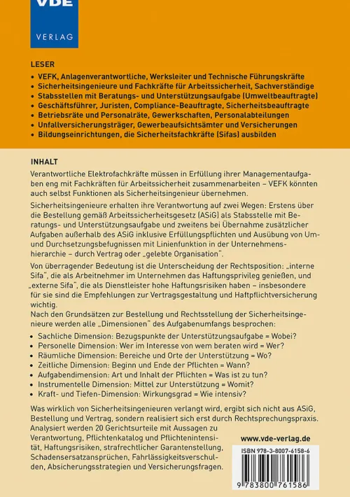 Sicherheitsingenieure erhalten ihre Verantwortung auf zwei Wegen: Erstens über die Bestellung gemäß Arbeitssicherheitsgesetz (ASiG) als Stabsstelle mit Beratungs- und Unterstützungsaufgabe und zweitens bei Übernahme zusätzlicher Aufgaben außerhalb des ASiG inklusive Erfüllungspflichten und Ausübung von Um- und Durchsetzungsbefugnissen mit Linienfunktion in der Unternehmenshierarchie durch Vertrag oder gelebte Organisation“.
