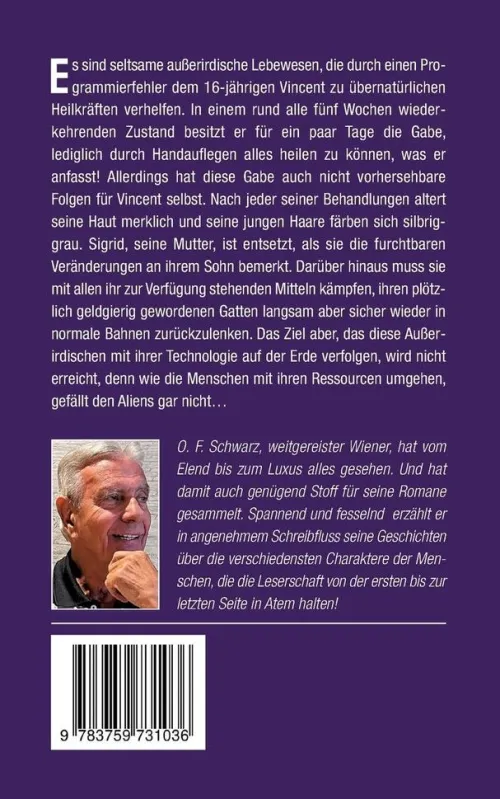 Merkwürdige außerirdische Wesen verleihen durch einen Programmierfehler dem sechzehnjährigen Vincent übernatürliche Heilfähigkeiten. Etwa alle fünf Wochen tritt ein Zustand ein, in dem er für einige Tage die Kraft hat, durch bloßes Handauflegen alles zu heilen, was er berührt. Doch diese Fähigkeit bringt unvorhersehbare Konsequenzen für Vincent mit sich. Seine Haut altert nach jeder Behandlung sichtbar und seine jungen Haare werden silbrig-grau. Sigrid, seine Mutter, ist schockiert über die entsetzlichen Veränderungen ihres Sohnes. Darüber hinaus muss sie mit allen ihr zur Verfügung stehenden Mitteln kämpfen, ihren plötzlich geldgierig gewordenen Gatten langsam aber sicher wieder in normale Bahnen zurückzulenken. Die Absichten der Außerirdischen, die ihre Technologie auf der Erde einsetzen, werden jedoch nicht erfüllt, da ihnen der Umgang der Menschen mit ihren Ressourcen missfällt!