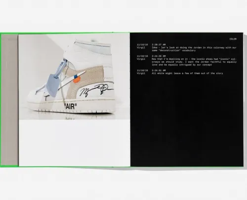 Um seine kooperative Arbeitsweise zu dokumentieren, setzte Abloh auf die gedruckte Seite. Für die Gestaltung des Buchs arbeiteten Nike und Abloh eng mit dem renommierten Londoner Designstudio Zak Group zusammen. Gemeinsam schufen sie dieses zweiteilige Kompendium, das zu gleichen Teilen Katalog und konzeptionelle Toolbox ist. Der erste Teil präsentiert die visuelle Kultur des Turnschuhs, während ein Lexikon im zweiten Teil Schlüsselpersonen, Orte, Objekte, Ideen, Materialien und Szenen definiert, aus denen das Projekt hervorgegangen ist. Texte von Nicholas Schonberger (Nike), dem Schriftsteller Troy Patterson, dem Kurator und Historiker Glenn Adamson sowie Virgil Abloh selber verorten die gemeinsame Arbeit innerhalb der Mode- und Designgeschichte. Ein Vorwort von Hiroshi Fujiwara stellt das Projekt in das historische Kontinuum der Gemeinschaftsprojekte von Nike.