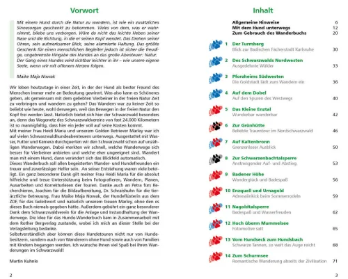 Das Buch stellt 42 hundegeeignete Touren vor – in verschiedenen Schwierigkeitsstufen und mit Hinweisen auf spezielle Anforderungen, die der Hund erfüllen sollte. Dazu gibt es viele Tipps zur entsprechenden Ausrüstung, zum Training, zur Erziehung, zur Gefahrenprävention und zum Umgang mit Notfällen. Die Wanderungen führen in alle Regionen des Schwarzwalds zwischen Kraichgau und Hochrhein. So geht es auf den Turmberg bei Karlsruhe, an den Mummelsee und in das liebliche Kinzigtal, es geht in den Nationalpark Schwarzwald und auf Feldberg und Belchen. Vorgestellt werden sowohl flache Wanderungen im Tal als auch anspruchsvolle Bergtouren – für Hunde aller Größe und jeden Alters. Alle Tourenvorschläge verfügen neben den hundespezifischen Infos über exakte Wegbeschreibungen, Kartenausschnitte mit Routenverlauf und aussagekräftige Höhenprofile. GPS-Tracks stehen zum Download bereit. Praktisch ist auch die Tourenübersicht in der Umschlagklappe des Buchs, die einen schnellen Überblick über sämtliche Touren und ihre Eigenschaften erlaubt.