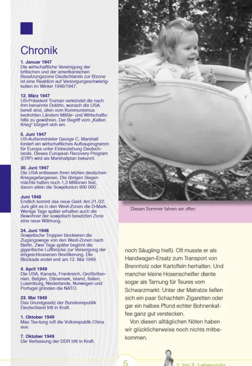 nAufgeregt und erwartungsvoll, so blickten wir damals in die Zukunft! Erinnern Sie sich mit uns an die ersten 18 Lebensjahre – an Ihre Kindheit und Jugend! Jahrgang 1947 – unsere Kindheit und Jugend fielen zusammen mit dem Wiederaufbau Deutschlands nach dem Krieg, mit der politischen Neuordnung der Welt, mit neuen Krisen und Kriegen. In den Jahren 1947 bis 1965 wurden aber auch die Weichen gestellt für die Welt von heute: Das Fernsehen hielt Einzug, das Auto machte die Massen mobil, Urlaubsreisen in fremde Länder erweiterten den Horizont, Raumfahrer strebten ins All. Wir Siebenundvierziger wurden Zeugen einer stürmischen Entwicklung. Begeistert erlebten wir den Aufbruch in die Moderne mit.