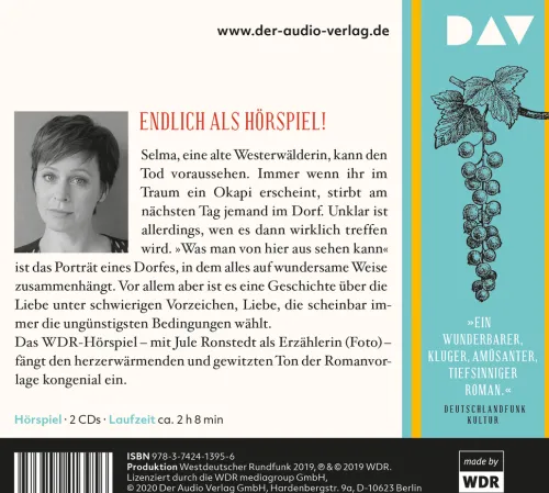 Selma, eine alte Westerwälderin, kann den Tod voraussehen. Immer, wenn ihr im Traum ein Okapi erscheint, stirbt am nächsten Tag jemand im Dorf. Unklar ist allerdings, wen es dann wirklich treffen wird. »Was man von hier aus sehen kann« ist das Porträt eines Dorfes, in dem alles auf wundersame Weise zusammenhängt. Vor allem ist es eine Geschichte über die Liebe unter schwierigen Vorzeichen, Liebe, die scheinbar immer die ungünstigsten Bedingungen wählt. Das WDR-Hörspiel – mit Jule Ronstedt als Erzählerin – fängt den herzerwärmenden und gewitzten Ton der Romanvorlage kongenial ein. Hörspiel mit Jule Ronstedt, Elisabeth Schwarz, Hans Kremer2 CDs | ca. 2 h 8 min