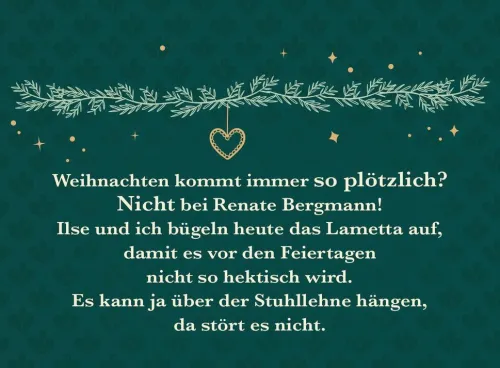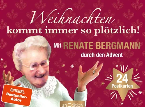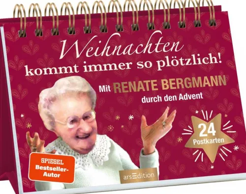 Der neue Renate-Bergmann-Adventskalender ist da! Auch in diesem Jahr verkürzt uns die Online-Omi mit ihren flotten Sprüchen und Anekdoten das Warten auf Weihnachten. Weihnachten kommt immer so plötzlich? Nicht für Renate Bergmann! Sie hat schon 82 Weihnachtsfeste erlebt und weiß ganz genau, wie man bei all dem Weihnachtstrubel den Überblick und vor allem die gute Laune nicht verliert.