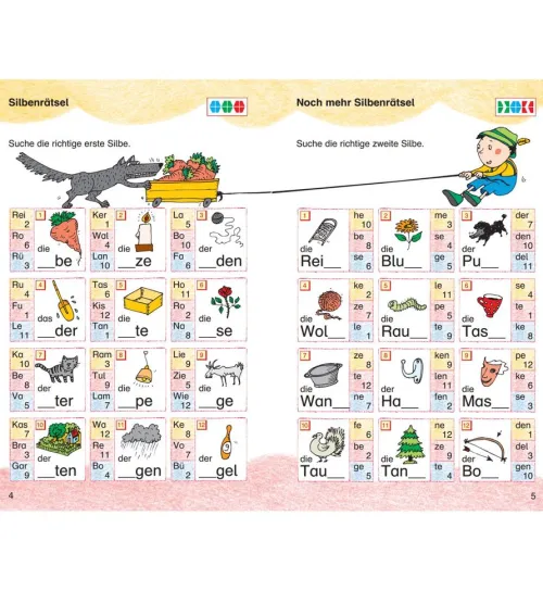 - Das Übungsheft „Erstlesestation 1“ mit Übungen zu Wortanfängen und Silben, zusammengesetzten Wörtern, Satzbildung mit Adjektiven und Verben, Bild-Wort-Zuordnungen, Reimwörtern, Lesetabellen und sinnerfassendem Lesen