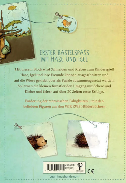 Mit diesem Bastelblock wird Schneiden und Kleben zum Kinderspiel! Die beliebten Figuren aus unseren WIR ZWEI-Bilderbüchern können auf über 20 Seiten ausgeschnitten und auf die Wiese geklebt oder als Puzzle zusammengefügt werden. So trainieren Kinder ab drei Jahren ihre motorischen Fähigkeiten und lernen spielerisch den Umgang mit Schere und Kleber. Ganz nebenbei entstehen dabei kleine Kunstwerke von Hase und Igel, die aufgehängt oder verschenkt werden können.