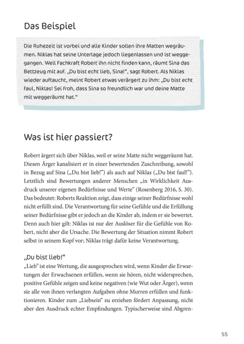 Lea Wedewardt beschreibt in diesem Buch anhand von ganz konkreten Beispielsituationen, was Worte bewirken können. Dabei schafft sie es, dass sich die Leserin oder der Leser regelmäßig wie „ertappt“ fühlt und unbedingt wissen möchte, wie es denn auch anders geht. Ganz ohne erhobenen Zeigefinger sensibilisiert sie für einen Umgang mit Sprache als „Wörterzauber“ statt als „Sprachgewalt“. Was macht achtsame Sprache aus und wie gelingt sie im oft hektischen und stressigen Alltag mit den Kindern?