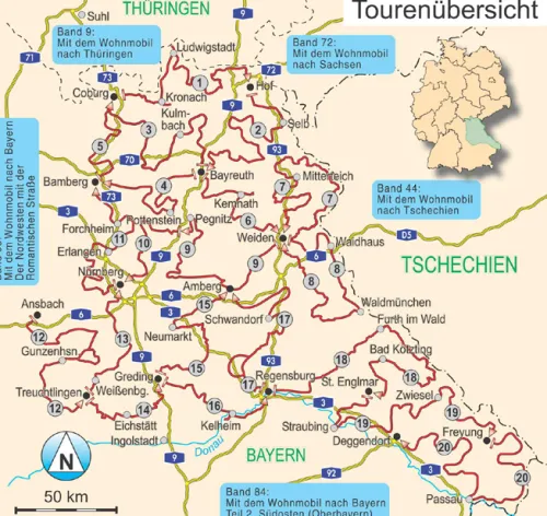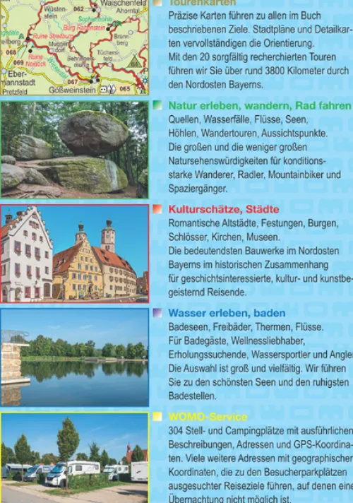 Präzise Karten führen zu allen im Buch beschriebenen Ziele. Stadtpläne und Detailkarten vervollständigen die Orientierung. Mit den 20 sorgfältig recherchierten Touren führen wir Sie über rund 3800 Kilometer durch den Nordosten Bayerns.
