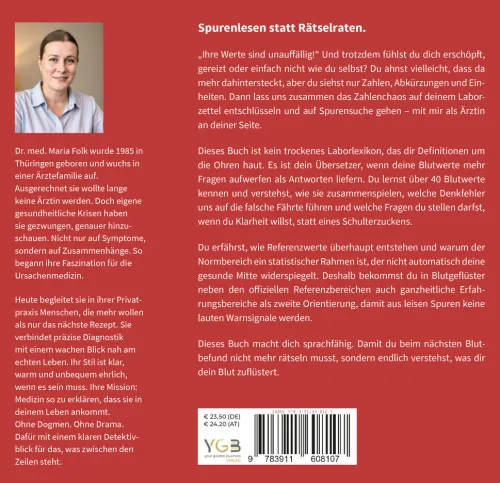 Du musst kein Medizinprofi sein, um deine Blutwerte zu verstehen. Dieses Buch macht es dir leicht, deinen Laborbefund selbst zu lesen, so dass du dich im Umgang mit deinen Blutwerten sicherer fühlst. Dr. med. Maria Folk zeigt dir als ganzheitlich arbeitende Ärztin, wie man Laborwerte sinnvoll versteht und gesundheitliche Zusammenhänge erkennt. Klar, alltagsnah und ohne unnötige Fachsprache. Blutgeflüster ist übersichtlich aufgebaut und hilft dir dabei, mit Leichtigkeit den roten Faden zu finden. Außerdem wirst du verstehen, warum Normwerte und Referenzbereiche nicht immer dein persönliches Gesundheitsoptimum abbilden. Was erwartet dich in Blutgeflüster? Du findest in diesem Buch über 40 zentrale Blutwerte einfach erklärt. Zu jedem Wert gibt es neben ausführlichen Erklärungen einen tabellarischen Vergleich zwischen offiziellen Referenzwerten und optimalen Erfahrungsbereichen als zweite Orientierung. Dazu kommen praktische Tipps für die Blutabnahme im Alltag und typische Stolperfallen: Stress, Schlafmangel (Erschöpfung und Müdigkeit), Infekte, Zyklus, Nüchternheit, Medikamente und Nahrungsergänzungsmittel. Einheiten- und Umrechnungstabellen helfen dir zusätzlich, wenn Laborwerte in unterschiedlichen Maßeinheiten angegeben sind. InhalteBlutbild, Schilddrüse (inklusive Antikörper als Hinweis auf eine Autoimmunerkrankung wie Hashimoto), Eisen und Eisenmangel (Ferritin), Blutfette, Cholesterin, Blutzucker und Insulin (Insulinresistenz), Leberwerte, Nierenwerte, Entzündung und Entzündungswerte, Vitamine (Vitamin D, Vitamin B12, Folsäure), Mineralstoffe und Mikronährstoffe (u. a. Magnesium, Zink, Selen) sowie Eiweiß und Homocystein. Ergänzend erklärt das Buch, warum bestimmte Blutwerte über die gesetzlichen Krankenkassen nicht immer abgedeckt sind und welche alternativen Möglichkeiten du hier hast. Zudem kannst du über einen QR-Code auf praxisnahes Bonusmaterial zugreifen. Blutgeflüster macht Schluss mit Rätselraten und übersetzt Blutwerte in Alltagssprache, so dass jeder seinen Laborbefund verstehen kann.