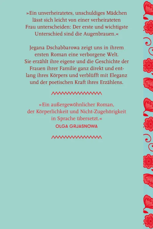 Ein poetisches Debüt über die Unterdrückung von Frauenrechten. »Ein außergewöhnlicher Roman, der Körperlichkeit und Nicht-Zugehörigkeit in Sprache übersetzt. « Olga Grjasnowa»Ein unverheiratetes, unschuldiges Mädchen lässt sich leicht von einer verheirateten Frau unterscheiden: Der erste und wichtigste Unterschied sind die Augenbrauen. « Die aserbaidschanische Community, die in Russland in der Diaspora lebt, ist streng konservativ. Schon als Kind kann sich die Erzählerin schwer in die patriarchale muslimische Gesellschaft einfügen. Eine Krankheit drängt und befreit sie zugleich aus ihrer Rolle der schönen, heiratsfähigen Tochter . . . Jegana Dschabbarowa zeigt uns in ihrem ersten Roman eine verborgene Welt. Sie erzählt ihre eigene und die Geschichte der Frauen ihrer Familie ganz direkt und entlang ihres Körpers und verblüfft mit Eleganz und der poetischen Kraft ihres Erzählens.